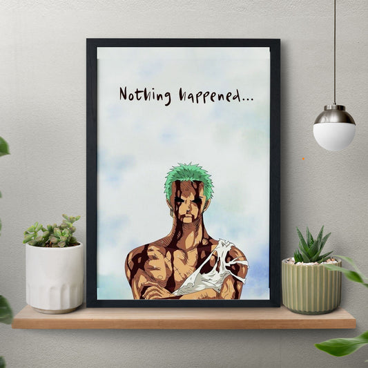 One Piece Nothing Happened Zoro Poster Art Framed (13x19 Inches, Plexi-Glass, Textured Frame)